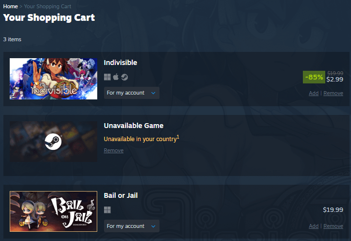 I had a game saved in my cart but now it's not availabe in my country. The link is https://store.steampowered.com/sub/183734/?snr=1_8_512_513 Posted by Abull7YT
