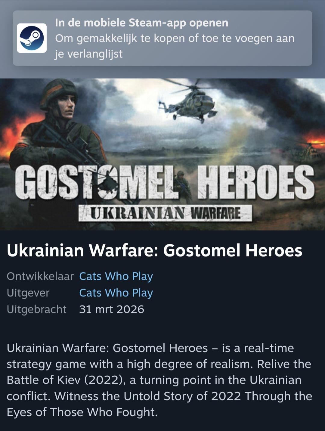 In the game called "Ukrainian Warfare Gostomel Heroes" they are spreading lies and celebrating the invasion of Ukraine and specifically Bucha, where war crimes happened. They blame Ukraine for the whole thing. You only get to play as Russia.