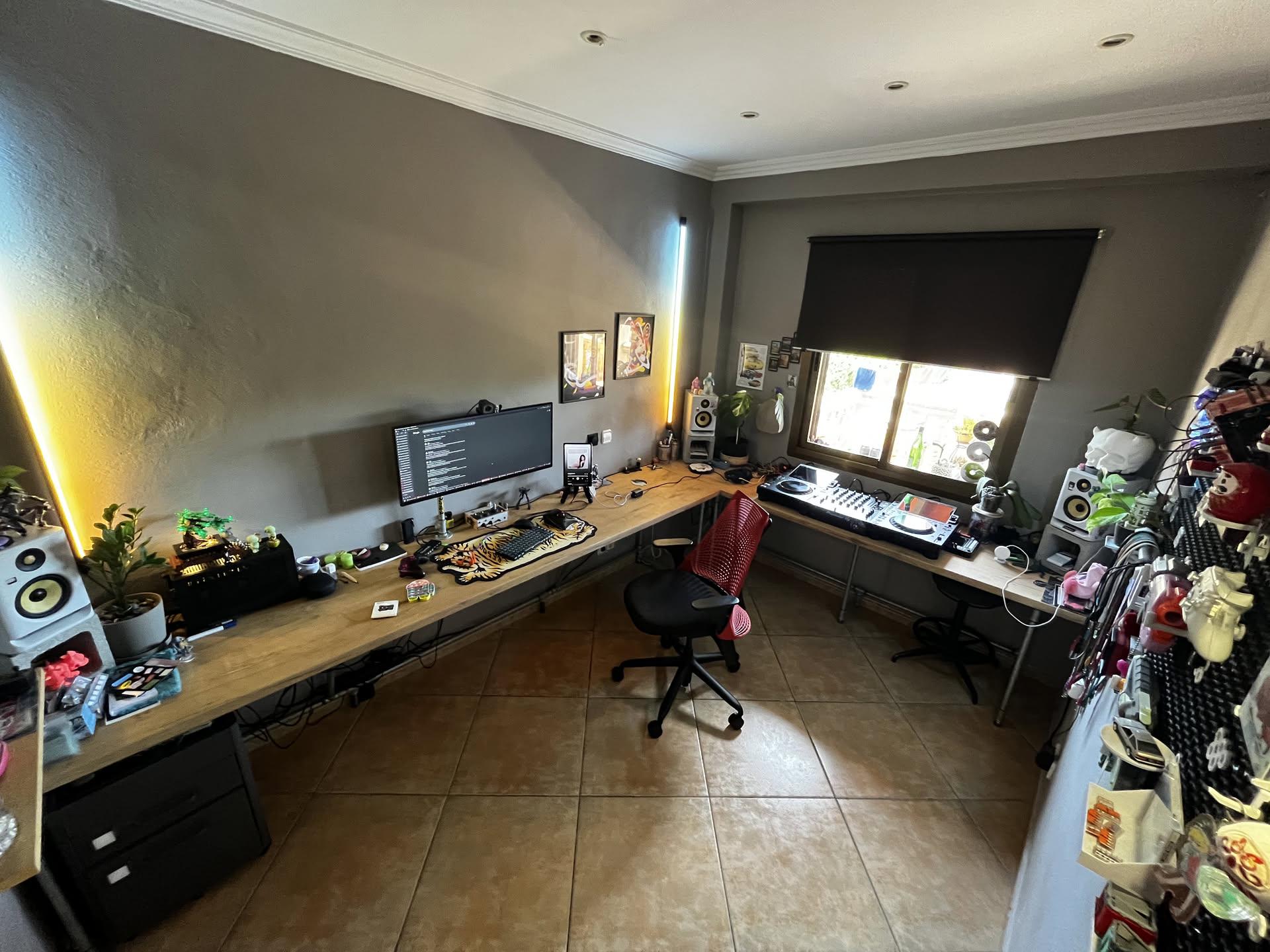 I built the desk myself from metal piping and countertop. I like to keep my desk uncluttered but I've been a bit messy as of late. Posted by e-chan42
