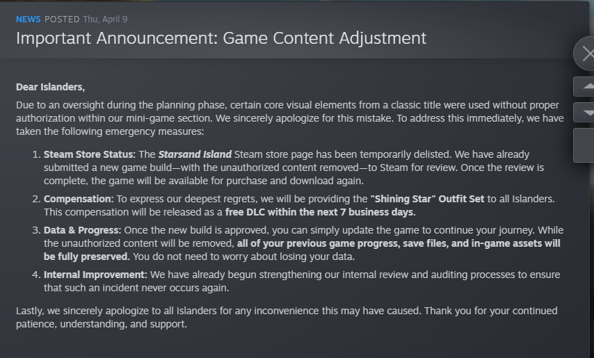 This appears to them realizing a mistake, owning the mistake, and trying to resolve the mistake. That’s actually better than most AAA publishers usually do (fuck you Ubisoft).
