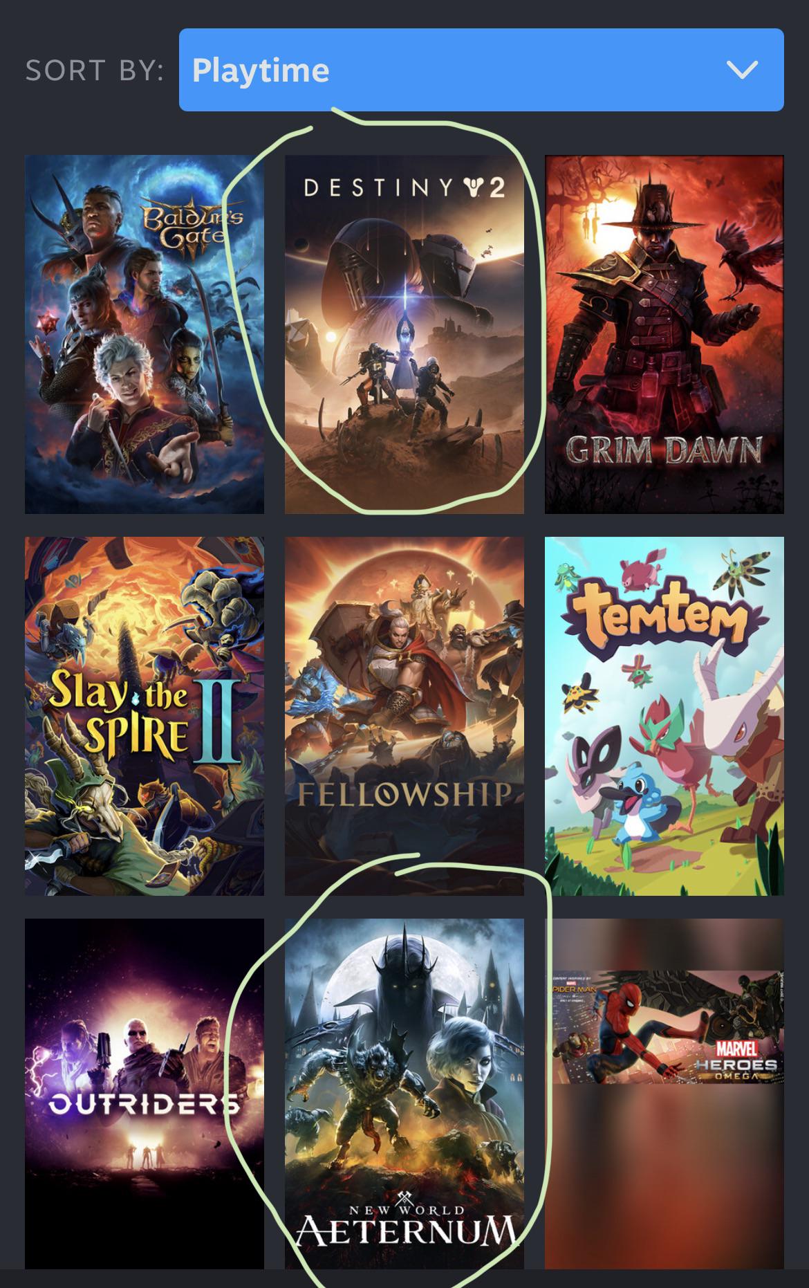 I have 373 hours in destiny 2 and 105 in new world, i hate seeing these games on my top played because i have an extreme dislike for these two games nowadays.