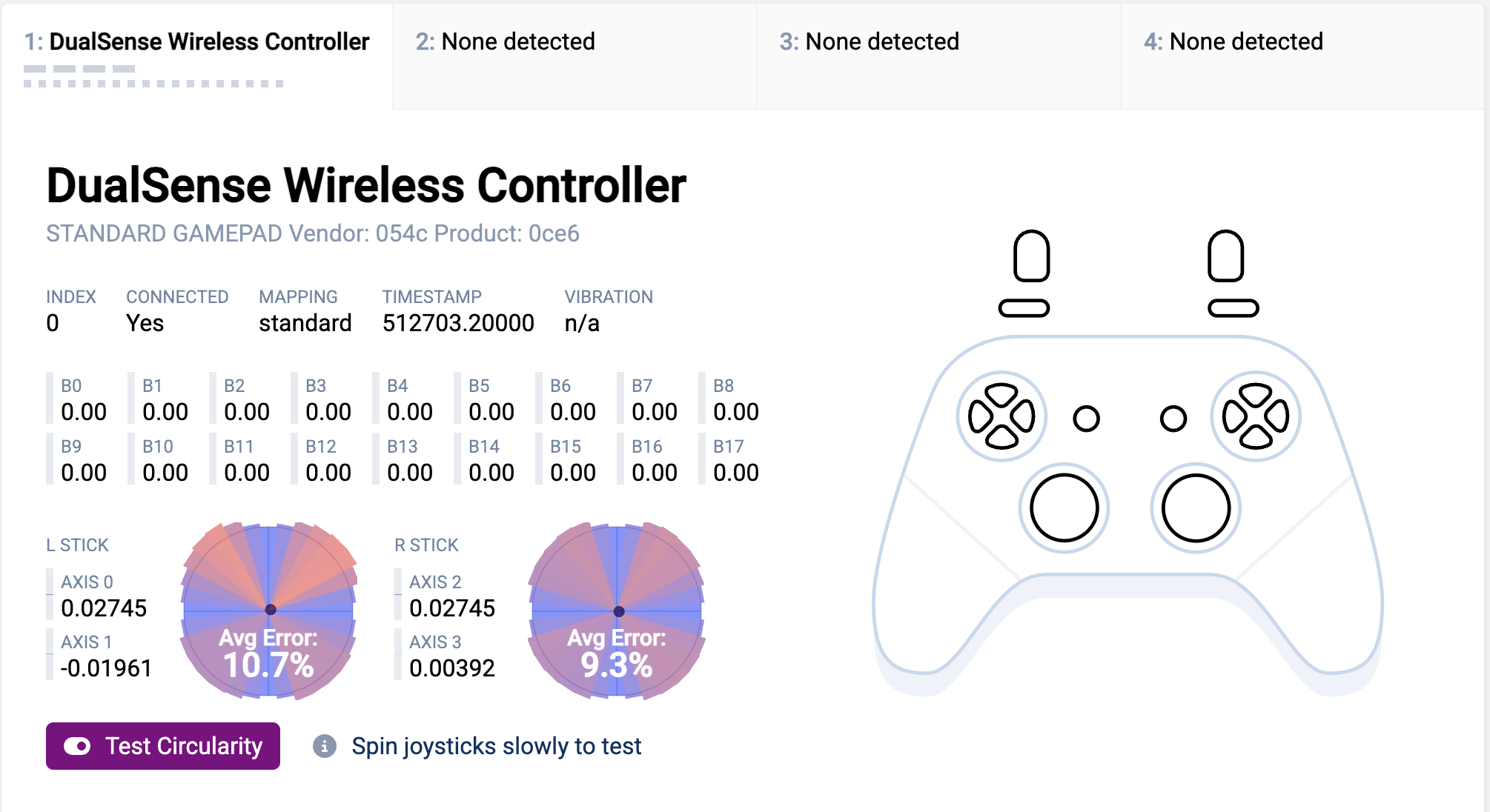 That’s normal for a stock dualsense for circularity, what you need to look for is when the controller is first plugged in on the GitHub and the sticks are neutral do they move on their own? That is drift, you can try to clean the potentiometers but it’s only a temporary fix, at that point they can be replaced with hall effect or TMR sticks for a longer lasting fix.