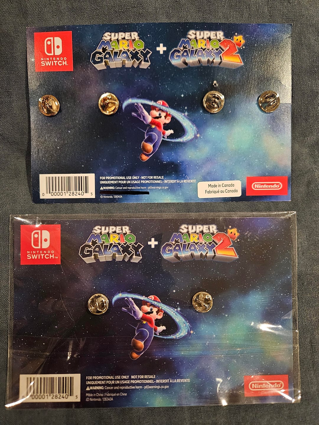 My girlfriend and I both collect Nintendo points and redeemed them for the 40th anniversary pins. One was from the first batch and one was claimed a couple weeks later. The top one was first and made in Canada. The bottom one was made in China. The quality difference is huge. The Canadian pins are heavy and have 2 pin backs. The Chinese ones are light, have 1 pin back, and feel like much cheaper quality.