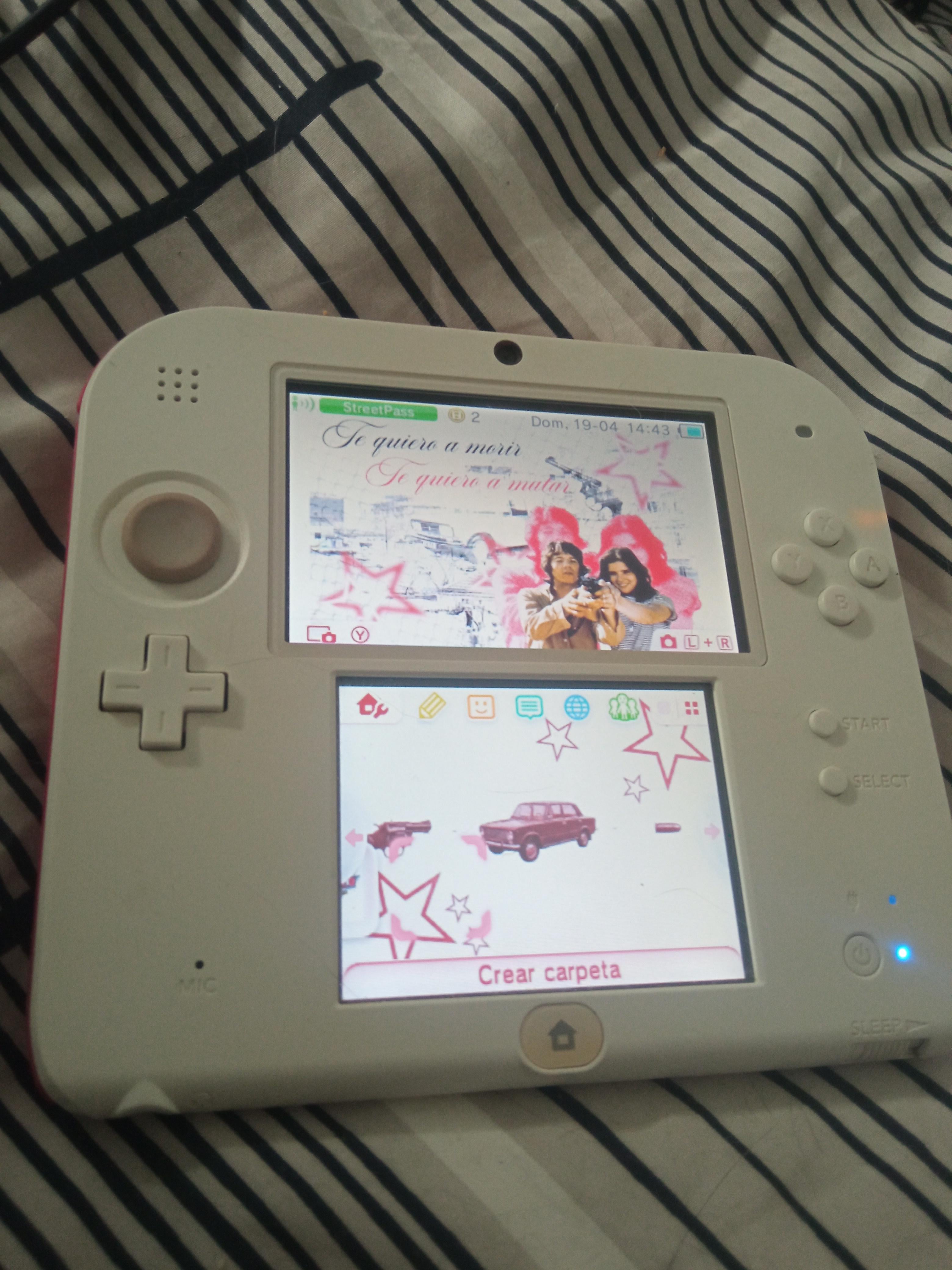Está es mi Nintendo 2Ds blanca y roja que venía con el Mario bros 2 y he hecho yo el fondo Posted by Dependent-Call-1351