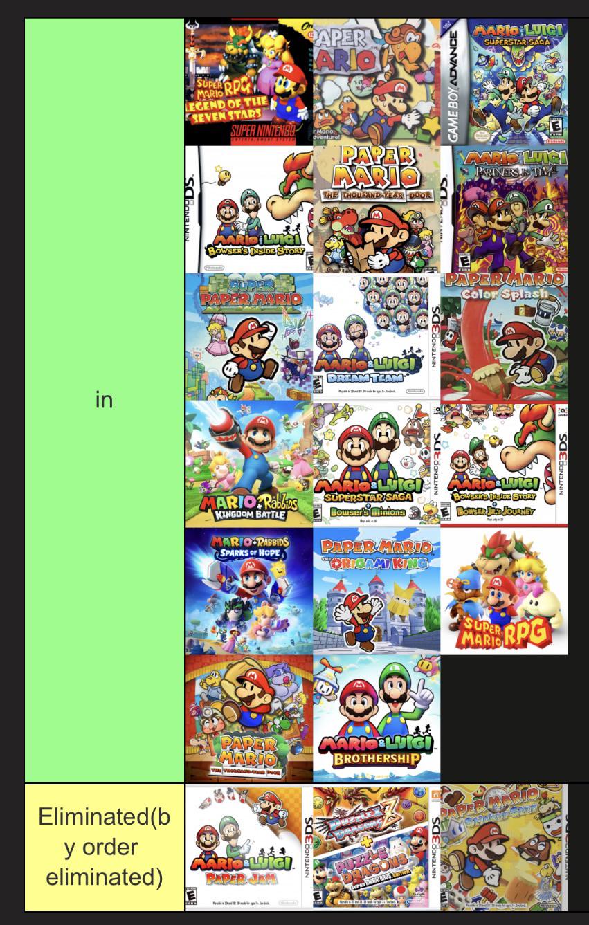 Paper jam is out with over 15 upvotes, remaining are 5 paper Mario games,5 Mario and Luigi games,both rabidds games,Mario RPG, and 4 remakes. Which game is 17th and next out? Posted by Present-Emu2254
