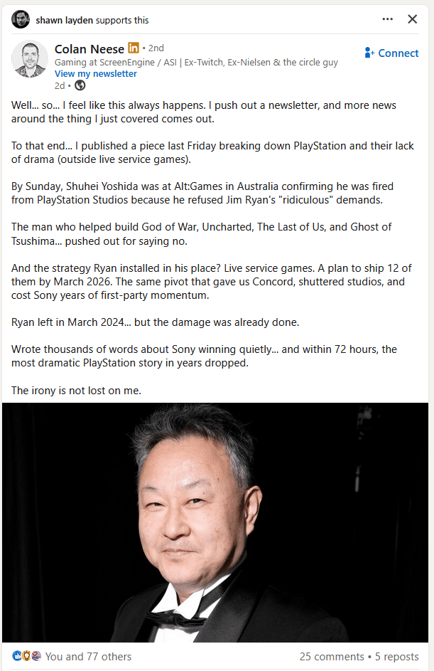 Laughing__Man_ on April 23, 2026 8:00 am “Pulled directly from LinkedIn this morning!” That was from 2 days ago. [Here is a bit more information for those curious. ](https://www.ign.com/articles/playstation-exec-shuhei-yoshida-reveals-firing-details)
