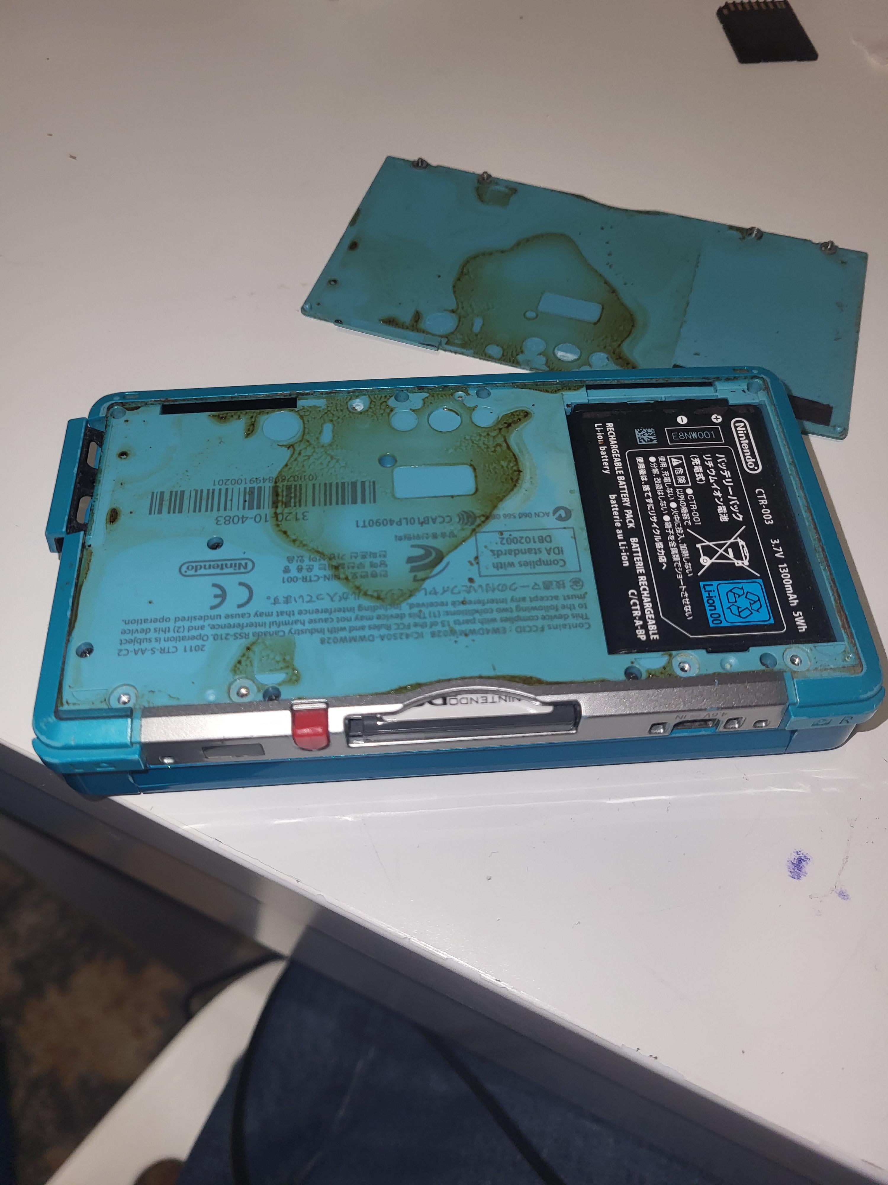 bought this 3ds second hand. i opened it up (the sd card lid wont close, as you can see) and it has this weird sticky liquid on the inside. is it some kind of liquid from the 3ds? or just from the previous owner. it smells lik soya or something.