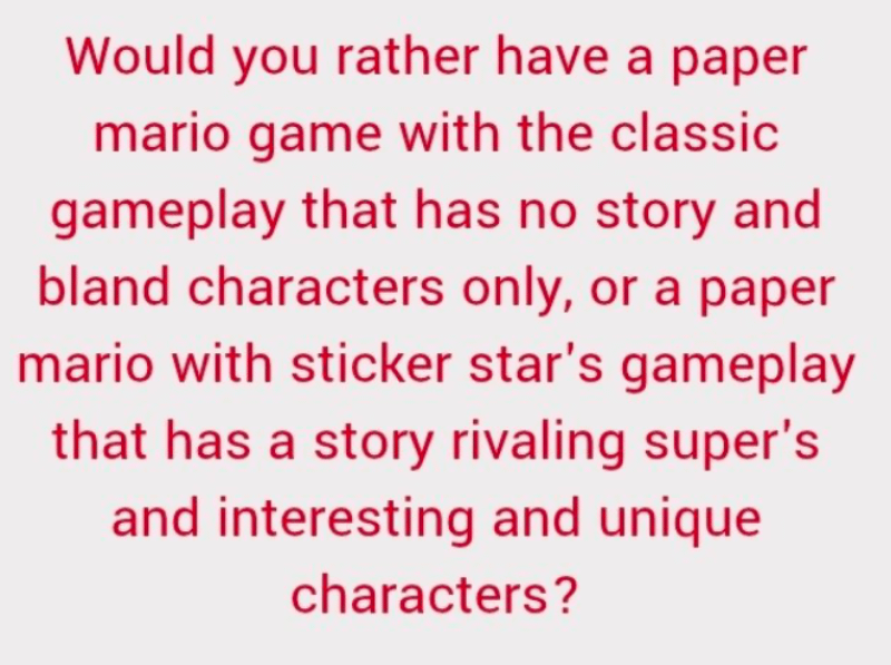 I'd go with the first option, because above all I want fantastic gameplay again, it's why Paper Jam was still a fun time.