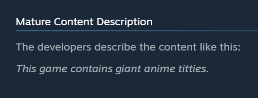 They should really add way to filter games based on these. I’d love to be able to filter out any game without giant anime titties.
