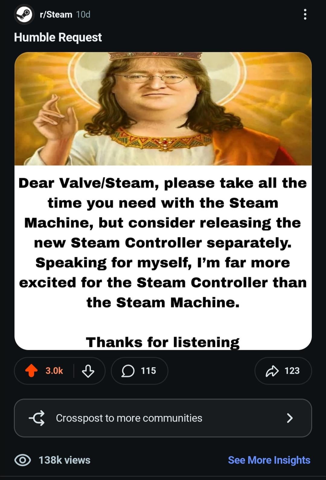 In the name of the Father (Gabe), the Son (Steam Deck), and the Holy Spirit (Half-Life 3 rumors), amen.